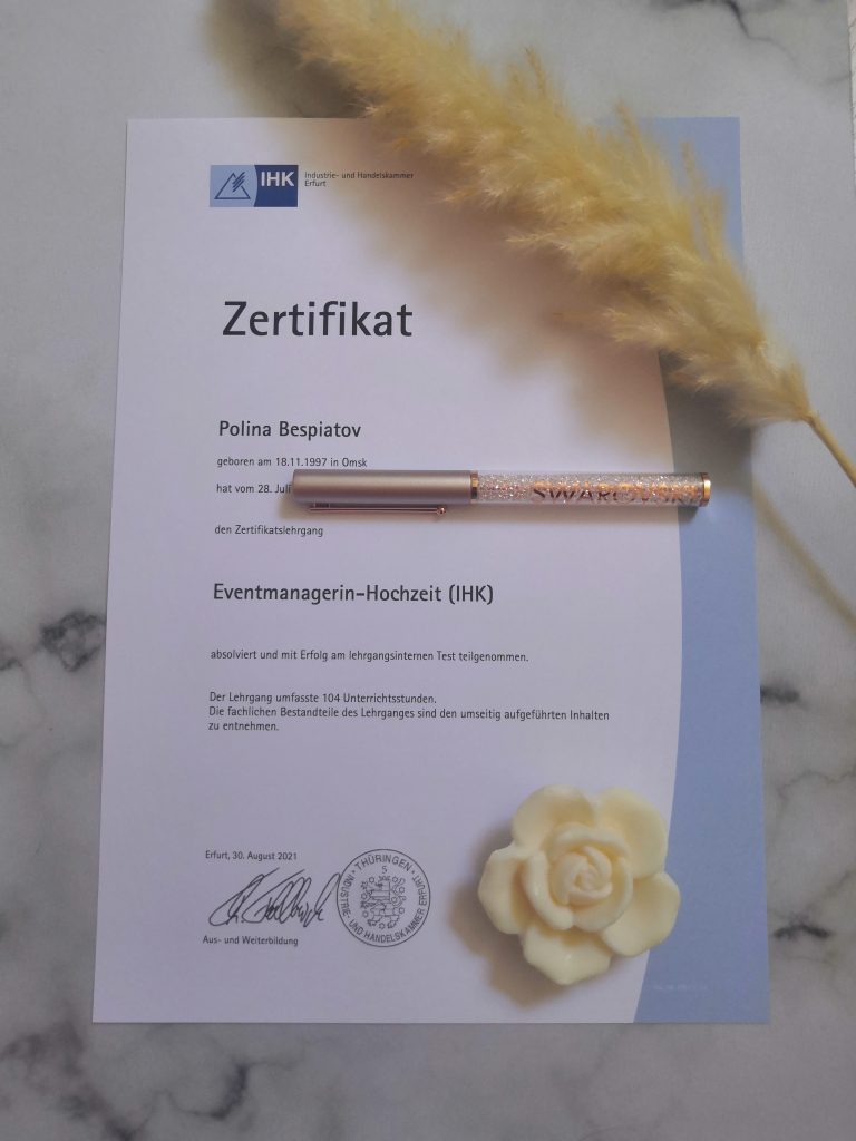 Ich war schon immer begeistert von dem besonderen Flair einer Hochzeit. Die Bereiche Planung und Organisation stellen einen wichtigen Aspekt in meinem Leben dar und ich habe ein gutes Auge fürs Detail. Da es mir unglaublich viel Spaß macht, andere Menschen mit der Planung bis ins kleinste Detail glücklich zu machen, fand ich meine Berufung in der Hochzeitsplanung. Und so entschied ich mich dazu, mich mit einem Abschluss zur Eventmanagerin – Hochzeit (IHK) im Bereich Hochzeitsplanung zertifizieren zu lassen.